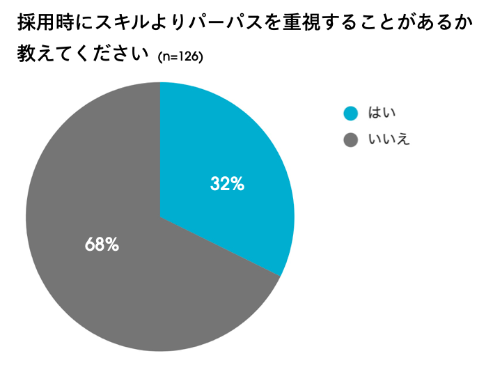 採用時にスキルよりもパーパスへの共感度合いを重視することがあると32%が回答しました。