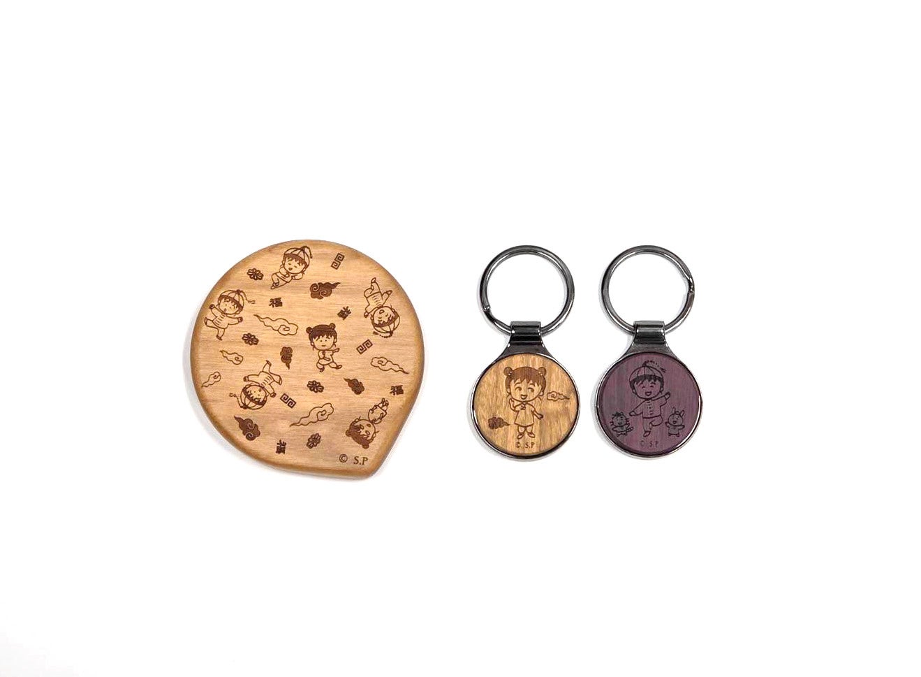 使うほど手になじむ、シンプルで上質な木製キーリングと、手のひらサイズで携帯に便利なスライド式の木製コンパクトミラーにちびまる子ちゃんたちを描きました。