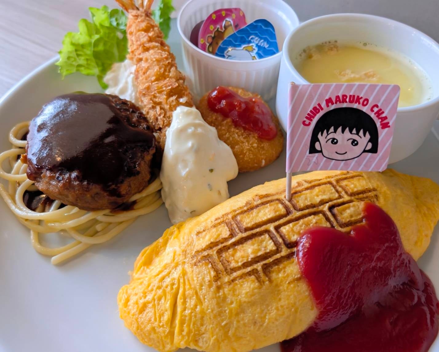 ちびまる子ちゃんの旗が付いた、ボリュームたっぷりのお子様ランチです。オムライスには、赤レンガの焼印模様も入っています。