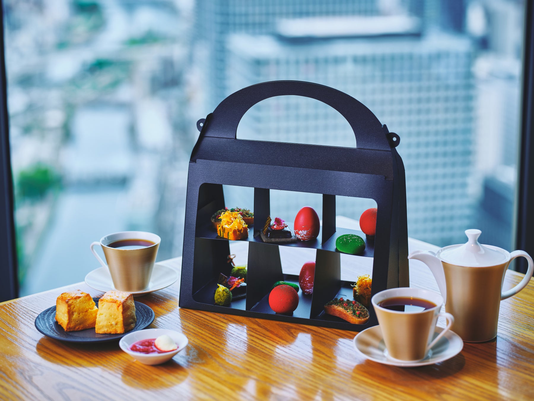 コンラッド大阪オリジナルの、ファッションバッグのようなボックスに入ったテイクアウトアフタヌーンティーもご用意しております。