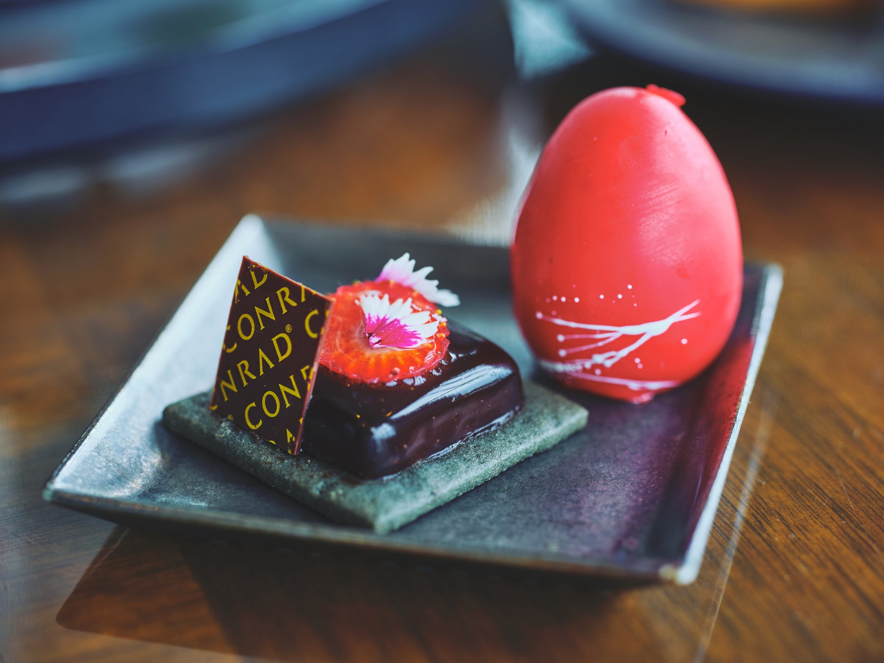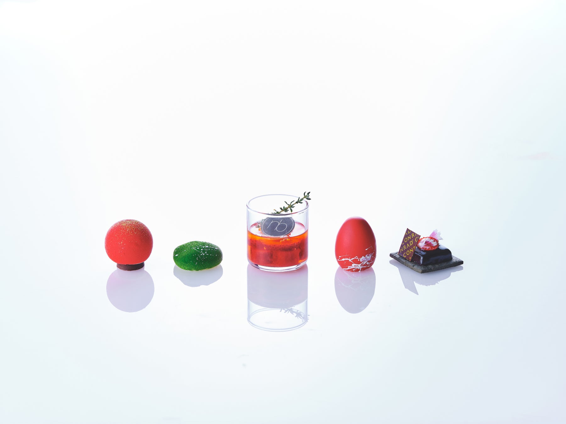 スイーツは合計6種類。ニコライ バーグマンのアイコニックな黒のフラワーボックスからインスパイアされた、ストロベリーチョコレートとジャスミンが香る「ベルベットノワール」や、同じくニコライ バーグマンならではの半球体のフラワーアレンジメントをストロベリームースで表現した「ルビーフラワー」、作品の中に登場する苔玉の質感を表現し、ストロベリークランブルを土に見立てた和の趣を感じるスイーツ「モスベリー」、蕾や花芯に見立てた卵型のスイーツは、カモミールが香るストロベリームースにミントのクリームを合わせた「フローラル」、花のグラスアレンジメントを表現し、ストロベリーとルバーブを重ねた美しい断面をお楽しみいただける「ボタニカル」、コンラッド大阪を象徴する胡蝶蘭の香りをまとわせて焼き上げた「胡蝶蘭香スコーン」は、クロテッドクリームとストロベリーソースを添えてお楽しみください。