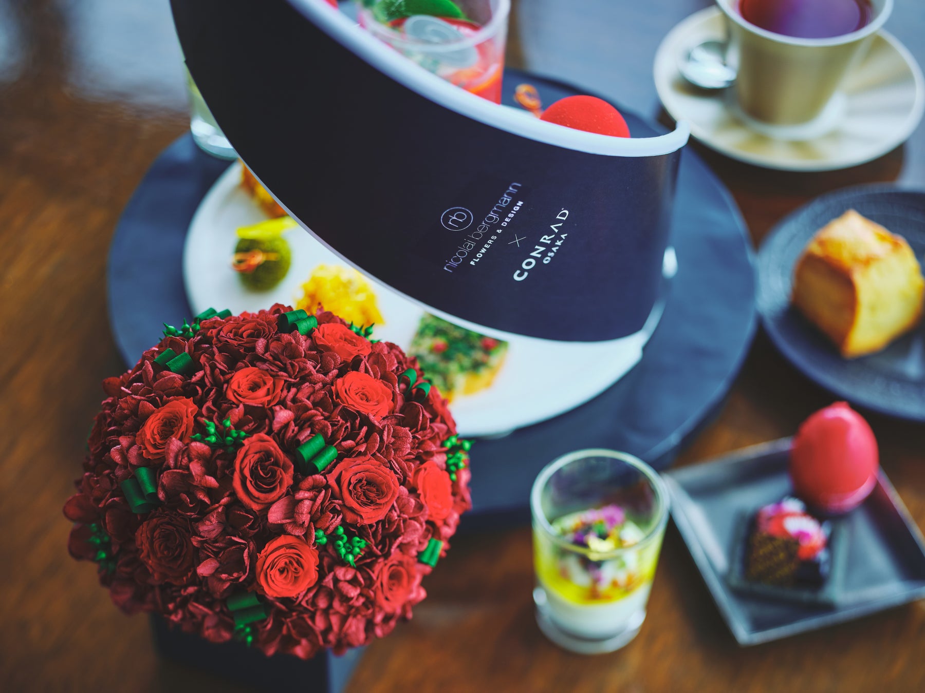 今回のコラボレーションにあたり、特別にデザインされたプリザーブドフラワーアレンジメントが1卓につき1つずつ飾られ、各テーブルに彩りを添えます。ニコライ バーグマンの世界観とアフタヌーンティーが一体となり、まるでテーブル全体が花に包まれているかのような空間で、ワンランク上の華やかなスイーツ体験をお楽しみください。