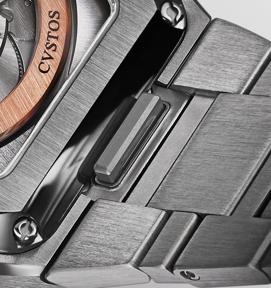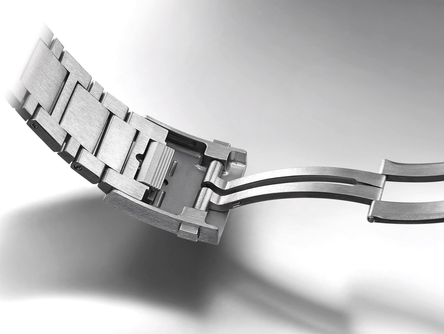 ブレスレットのリンク部に巧みに彫刻された模様は、ケースに施した洗練を極める仕上げ加工と完璧にマッチしているだけでなく、腕に着けたときの装着感を最適にする役割も果たしています。ツールを使わずにストラップを交換できるシステムは特許を取得しており、ラグの裏側に組み込まれたシングル プッシュ ボタンを押すと、ブレスレット、ラバーストラップ、アリゲーターストラップのいずれにも簡単に交換することができます。また腕周りの微調整に関しても専用の工具は必要ありません。