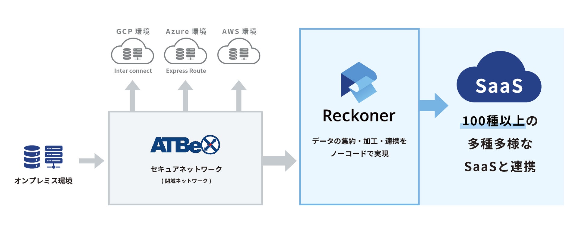 この状況を背景に、スリーシェイクはアット東京の「ATBeX」への接続を通じて、スリーシェイクが提供するクラウド型データ連携ツール「Reckoner(レコナー)」とオンプレミス環境やマルチクラウドとのデータをスムーズかつ安全に連携し、データの集約、加工、連携を迅速かつ容易に行うことを可能としました。