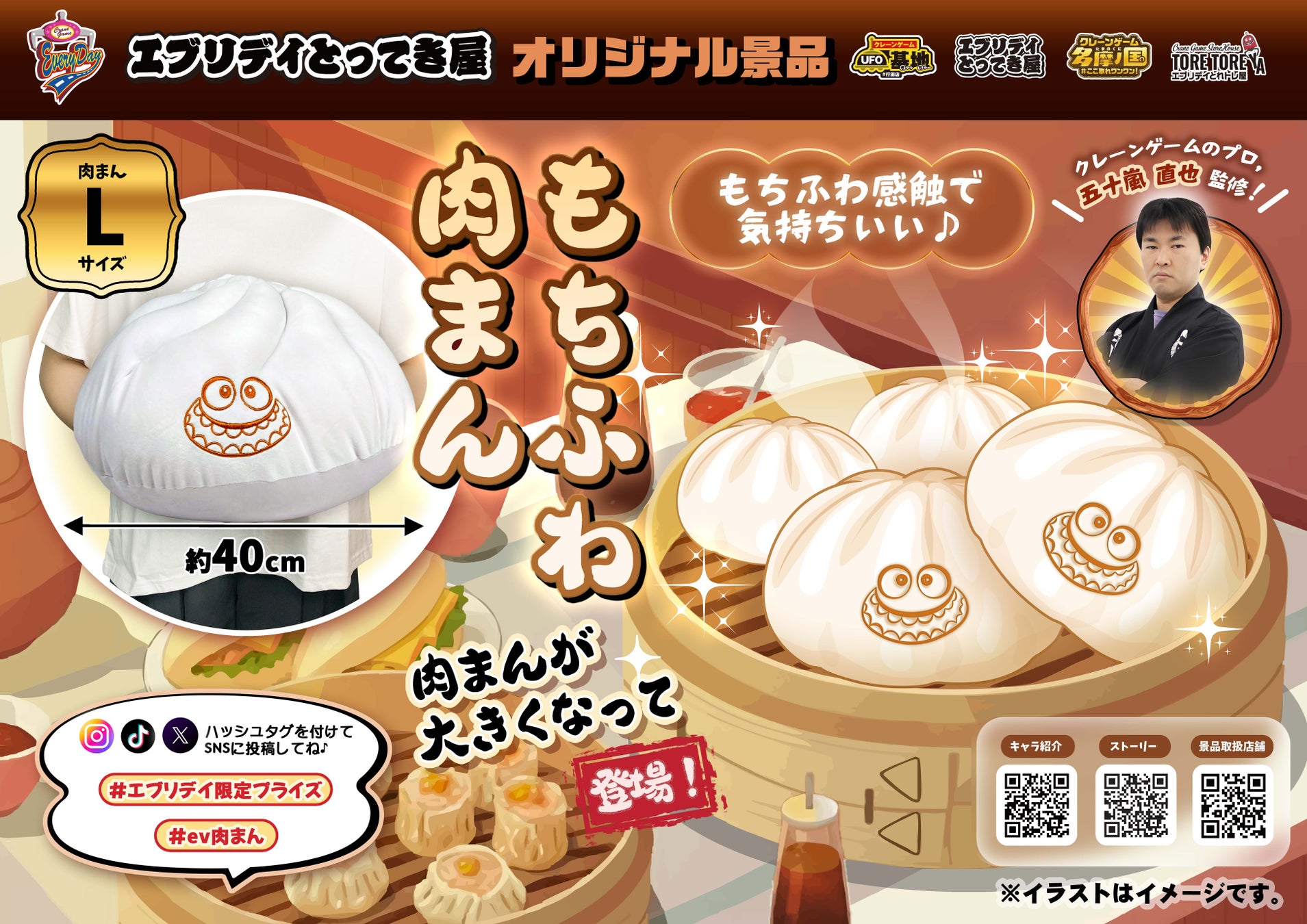 サイズは約40cmのビッグサイズで、抱きしめると“もちもち・ふわふわ”の心地よさが全身を包み込みます。さらに今回の肉まんには、エブリデイとれトレ屋 桶川店のキャラクター「トレ」の顔が刺繍された特別なデザインを採用。