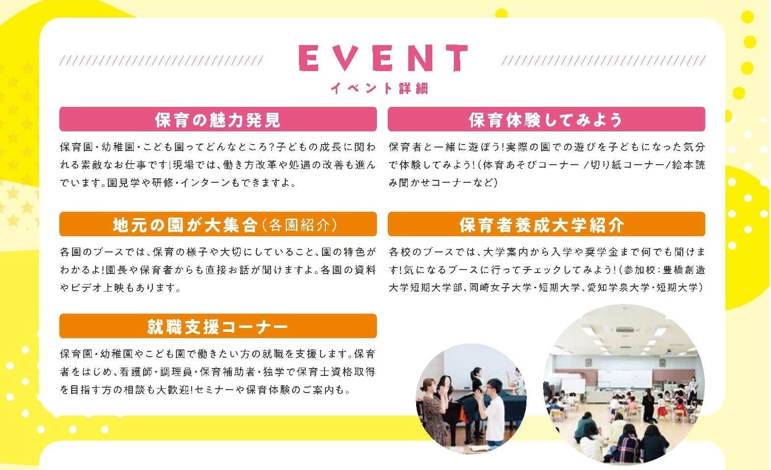 保育者になりたい中高生から、就職を考えている学生、保護者の方や子ども好きな方まで、ぜひ足を運んでみませんか?