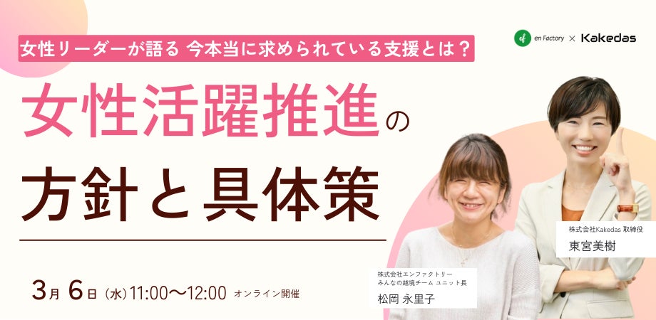 そこで本セミナーでは、まさに自身が女性リーダー(役員、事業責任者)として活躍している株式会社Kakedas 東宮と株式会社エンファクトリー 松岡とともに、「女性活躍支援が進まない理由」と「その対応策」について実体験や事例とともに掘り下げます。