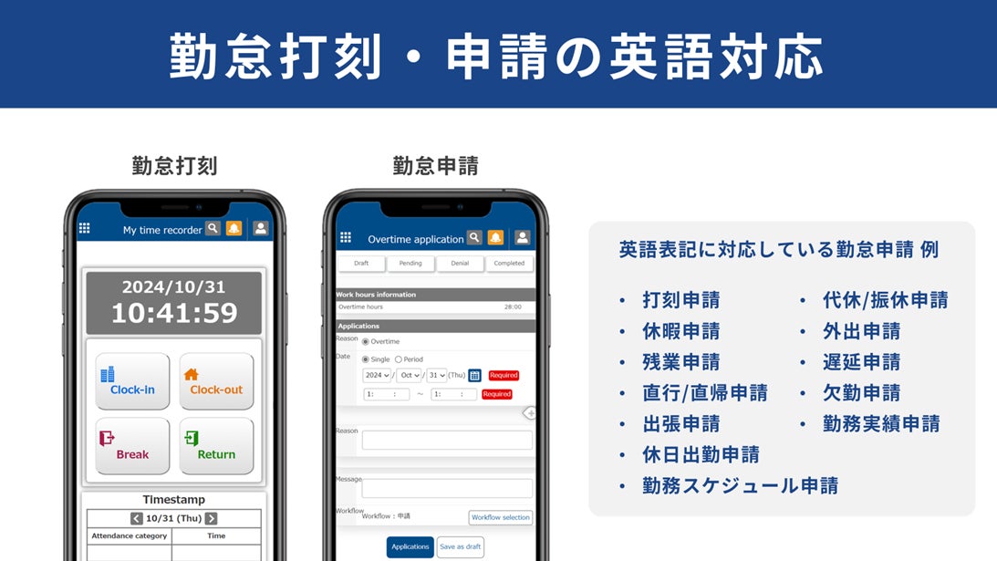 外国人従業員は、日々対応しなければならない出退勤打刻、残業や有給休暇などの勤怠申請を英語表記のWebページで行えるため、業務担当者は個別に使い方を説明する必要がなく、スムーズに運用を開始できます。外国人従業員を含む企業全体で法令遵守・マネジメントが行えます。