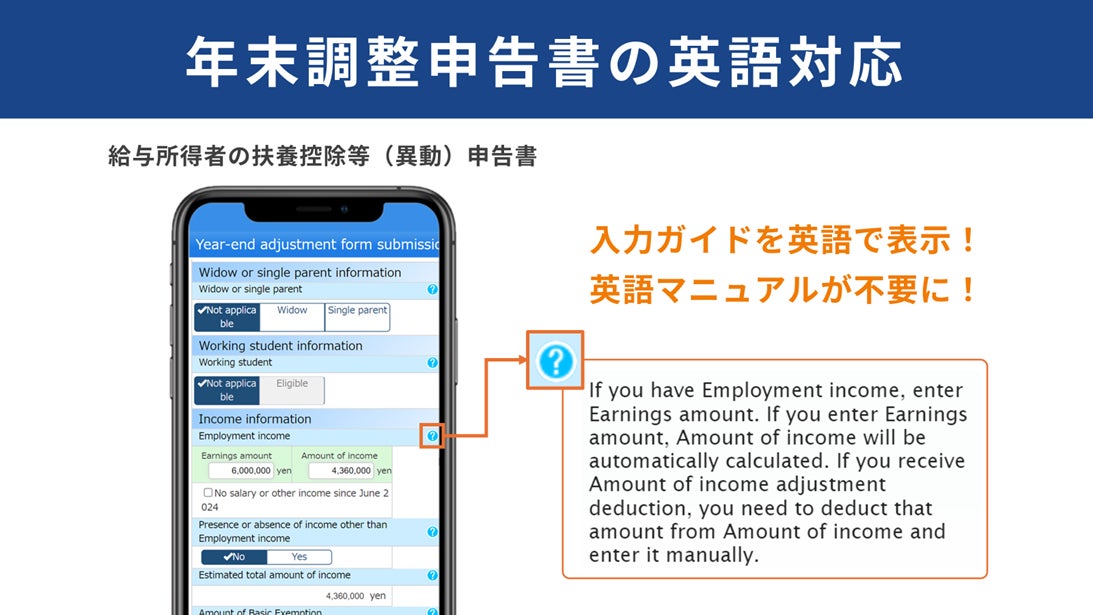 外国人従業員にとって時間のかかる年末調整申告書は、英語表記のWebページからかんたんに提出できます。