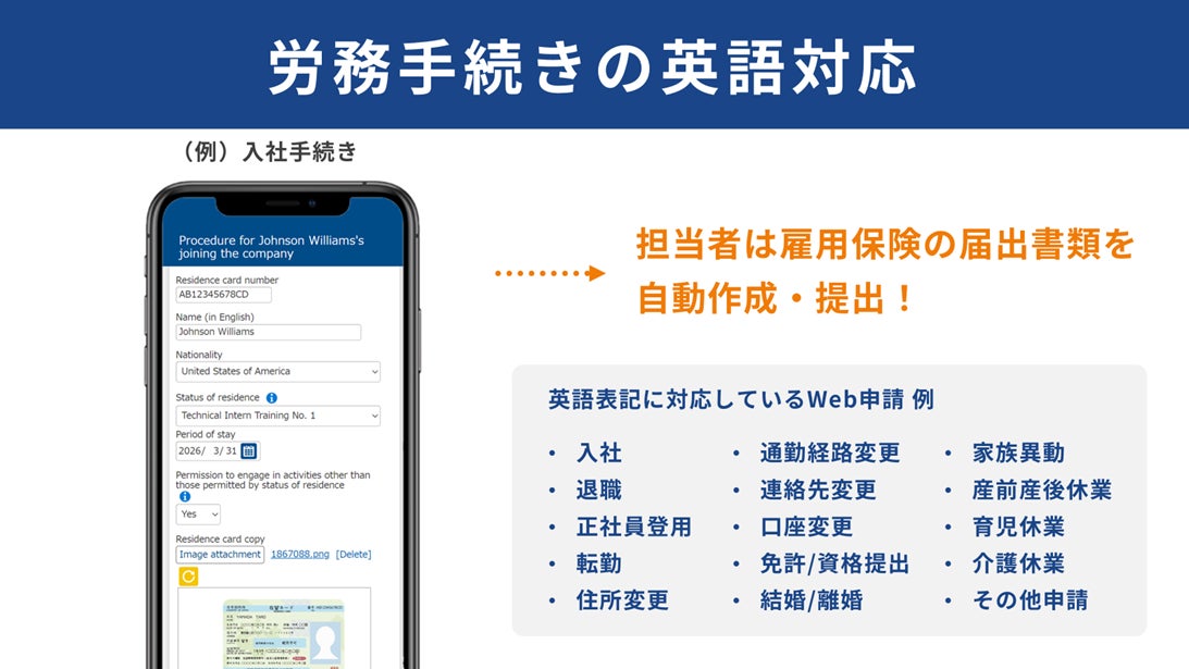 外国人従業員は、英語表記のWebページで入社(在留カードの情報を含む)の提出や住所変更などの労務手続きが行えます。