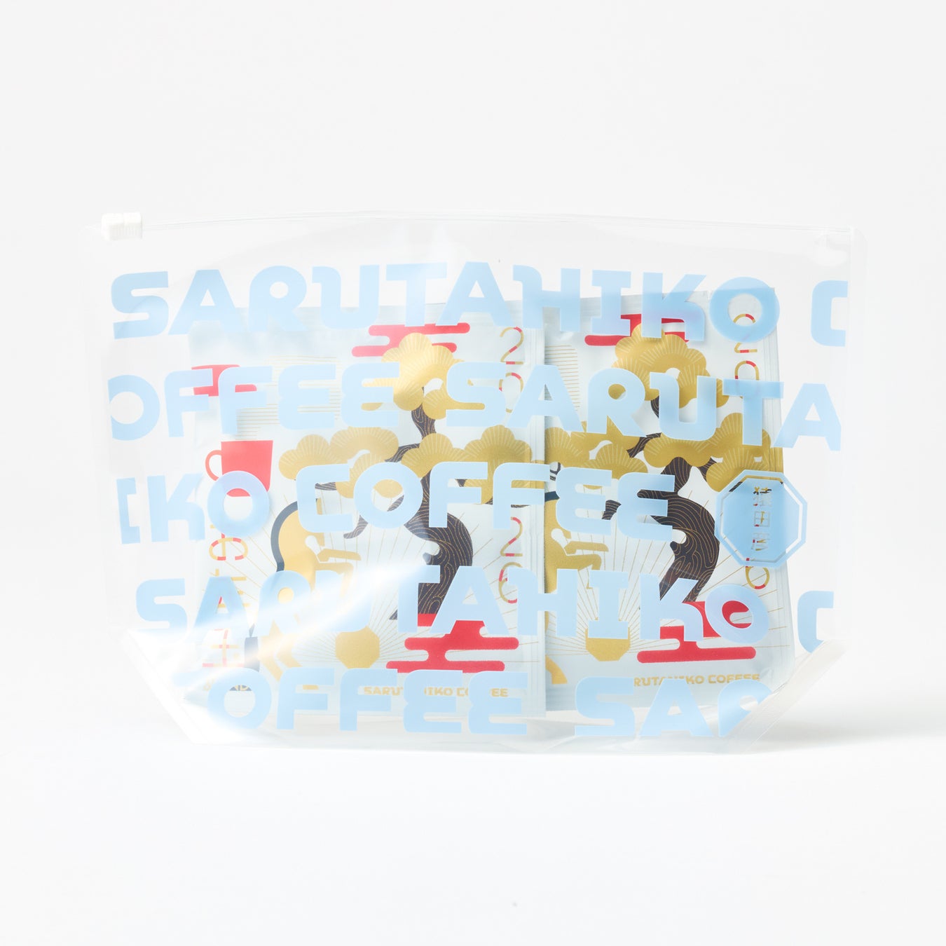 猿田彦珈琲の英字ロゴを大胆にあしらった、通年使いやすい福袋限定デザイン。コンパクトで手軽に持ち運べ、ドリップバッグや小物をまとめるのに最適です。