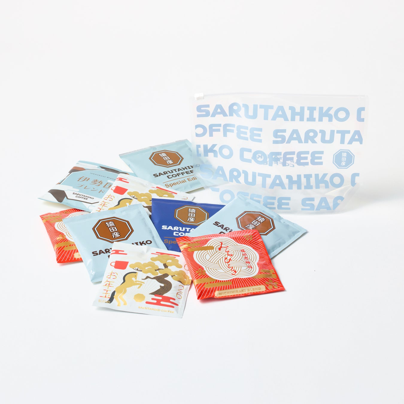 ドリップバッグの種類:大吉ブレンド、みちひらきブレンド、猿田彦フレンチ、ワインとブーケ、巣ごもりブレンド、ニューコーヒーパラダイスコーヒーバッグ、Once Upon a Time in...東京、伊勢国ブレンド、The Bridge 原宿ブレンド、駒澤ブレンド、恵比寿シティ、猿田彦珈琲 Special Edition、リトル調布ブレンド、ブレーブス イン ザ ハウス、明日のブレンド(淀屋橋駅店デザイン)、明日のブレンド(くずはモール店デザイン)、お年玉ブレンド
