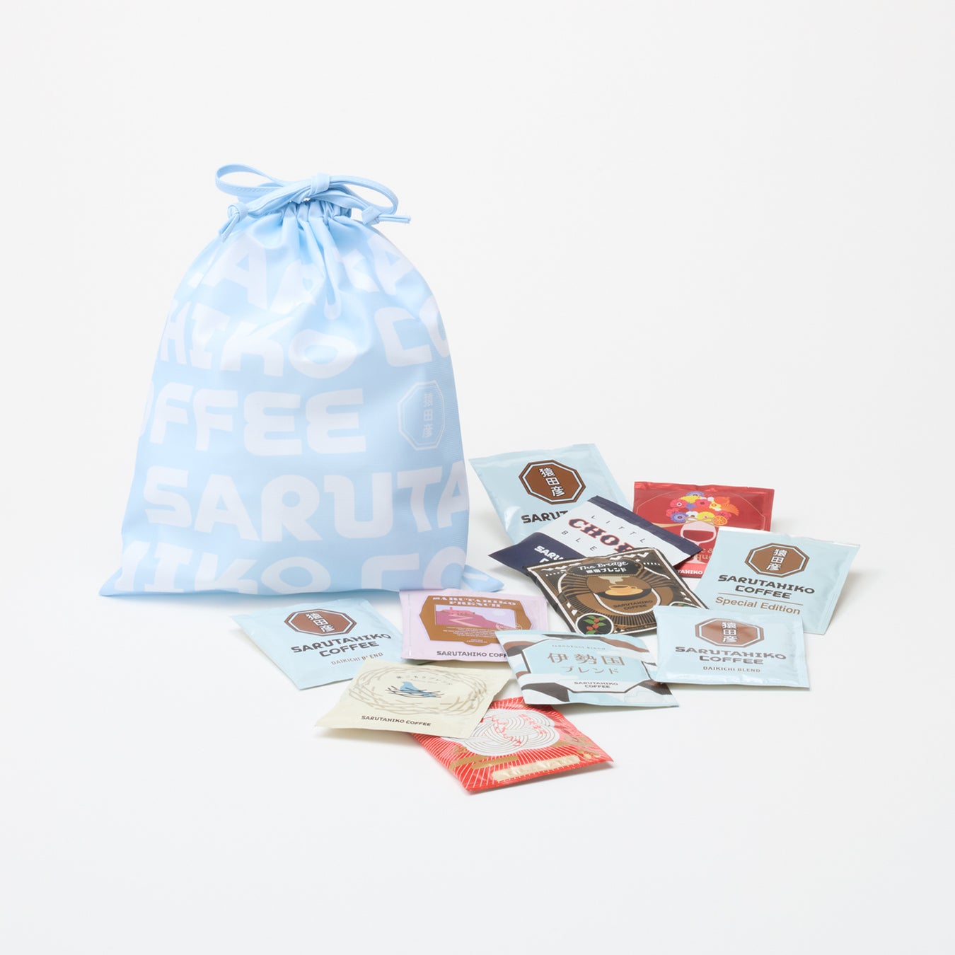 普段から猿田彦珈琲のドリップバッグをご利用の方や、地方店舗限定のドリップバッグを手に取りやすい価格で楽しみたい方におすすめ。福袋限定巾着付き。