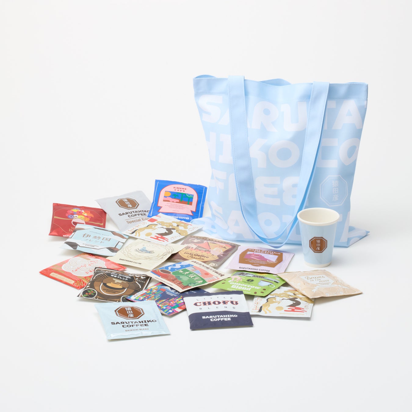 普段から猿田彦珈琲のドリップバッグをご利用の方や、地方店舗限定のドリップバッグを、味わいもデザインも楽しみながら大容量で楽しみたい方におすすめ。福袋限定トートバッグとセラミックカップ付き。