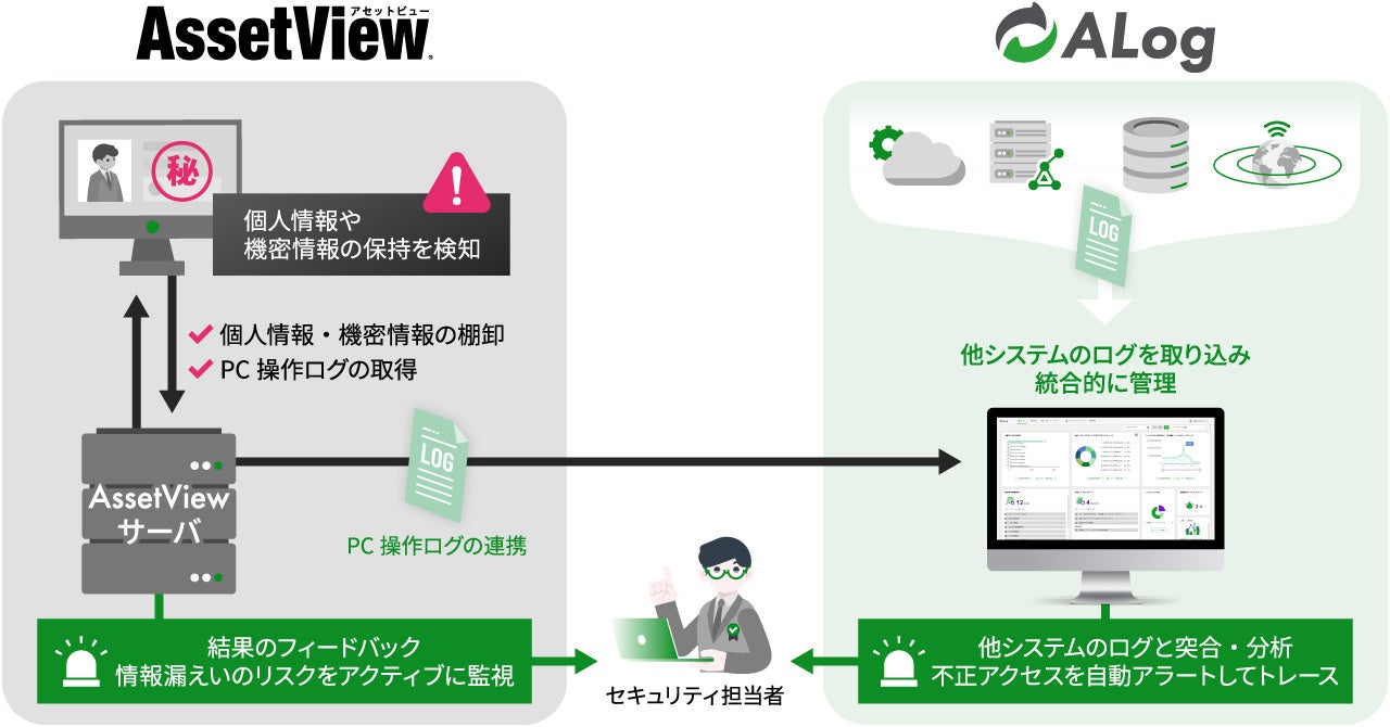 この度の連携で、「AssetView」の能動的なモニタリングよって取得した、クライアントPC内での個人情報や機密データの操作ログを「ALog」に連携し、「ALog」が他システムのログと統合的に管理することで、情報漏えいなどの迅速な検知・網羅的な分析および追跡が可能になります。