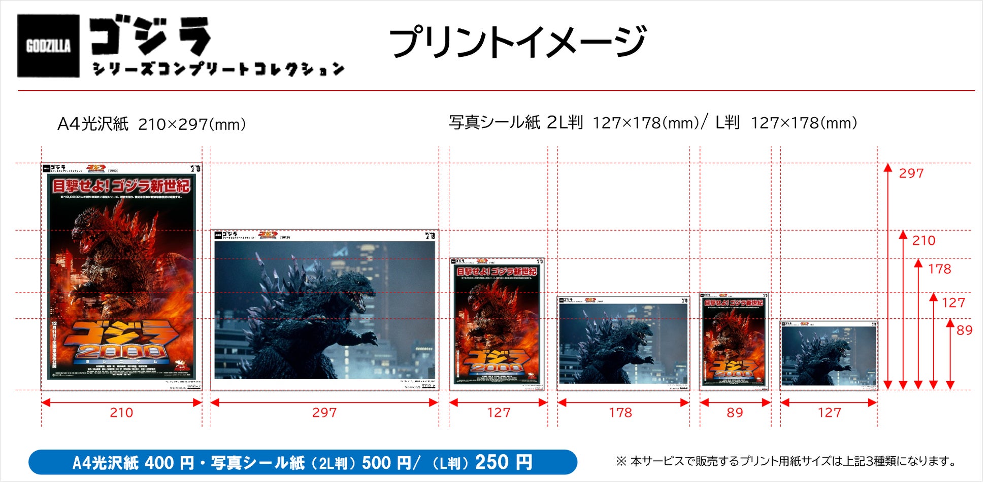 【ゴジラ シリーズ コンプリートコレクション】では、作品の魅力を心行くままに楽しんでいただくための最適サイズとして、保存にも掲出にも最適な厚手用紙の「A4光沢紙」と、写真品質で裏面がシール加工されている「写真シール紙(2L判)」「写真シール紙(L判)」の3種類での販売となります。