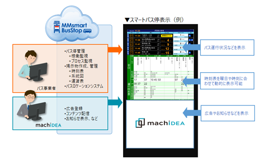 デジタルサイネージや電子ペーパーにバスの運行時刻表はもちろん、その他の告知文や広告などをリアルタイムに表示できるバス停のことで、現在の曜日や時間帯の時刻を大きく、わかりやすく表示できるなど、お客様の利便性向上にも寄与する機能を備えています。また、遠隔操作や公共交通機関関連情報の標準データフォーマット「GTFS-JP」連携により、時刻表作成業務の自動化が可能となり、張り替え作業が不要となるため、バス事業者様のDX推進に大きな効果が期待されます。