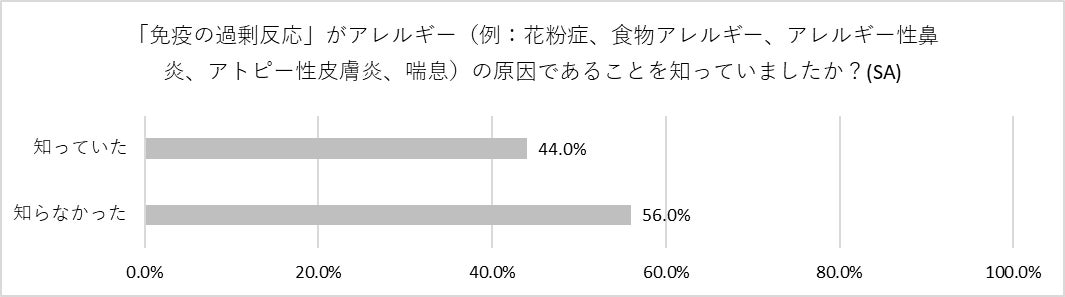 「免疫の過剰反応」がアレルギーの原因であることを知っていた人は半分に満たない結果になりました。また、風邪のような症状がアレルギーの可能性であることを知っていた人も半分程度となりました。