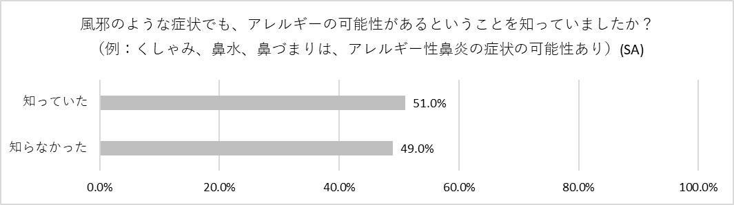 ②「風邪だと思っていた症状がアレルギーの可能性あり」を知っている人は半分程度にとどまる