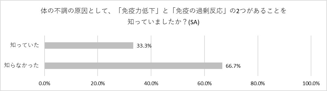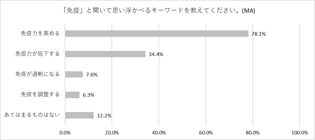 「免疫」と聞いて思い浮かべるキーワードを尋ねたところ、8割が「免疫を高める」と回答。「免疫を調整する」、「免疫が過剰になる」と答えた人は1割にも満たない結果になりました。さらに、免疫には“低下”と“過剰”の両面があることを知っている人は3割という結果に。