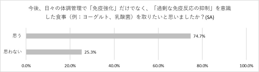 一連の設問を通して、「今後は免疫を高めるだけでなく、免疫を整えることも意識したい」と答えた人は7割にのぼり、多くの人が“一過性の感染症”予防や“免疫力低下の対策”だけでなく、“体調のベースづくり(免疫調整)”としてのヨーグルト・乳酸菌摂取の重要性に気づき始めていることがわかりました。