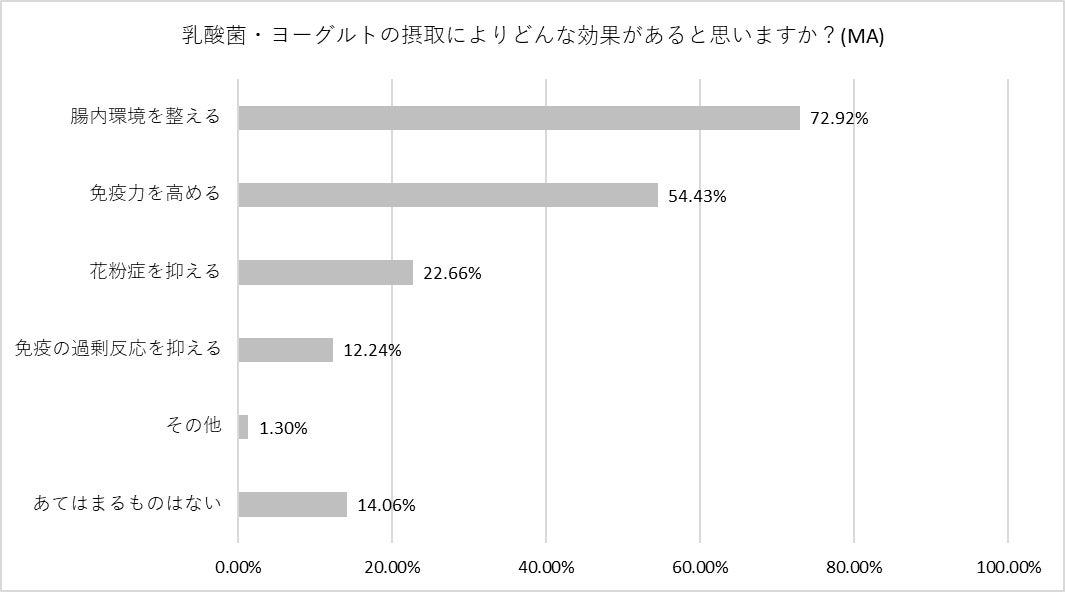 「ヨーグルトや乳酸菌が免疫に与える効果」については、「免疫力を高める」が7割と圧倒的。一方、「免疫を整える(過剰反応を抑える)」と回答した人は1割にとどまりました。「ヨーグルト=免疫」の認知は浸透していますが、あくまで「免疫力向上」のイメージにとどまっているようです。