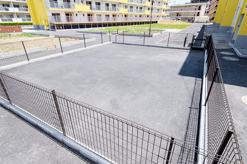 1800坪に2棟だけのゆったりとした敷地使いで、中央部には芝生のハラッパがあり、子供ものびのびと遊べる環境。敷地内には農園やドッグラン、イベントスペース、保育園も設置。