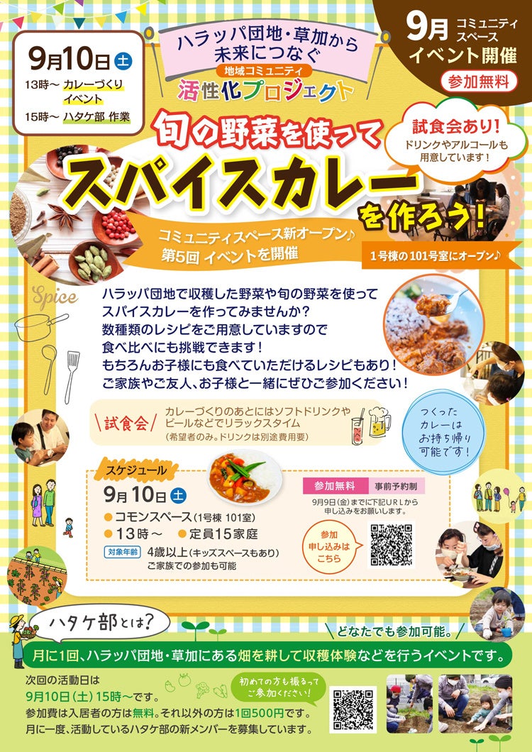 | 2022年9月10日 | スパイスカレー作り https://harappadanchi.jp/event/20220910_2/ |