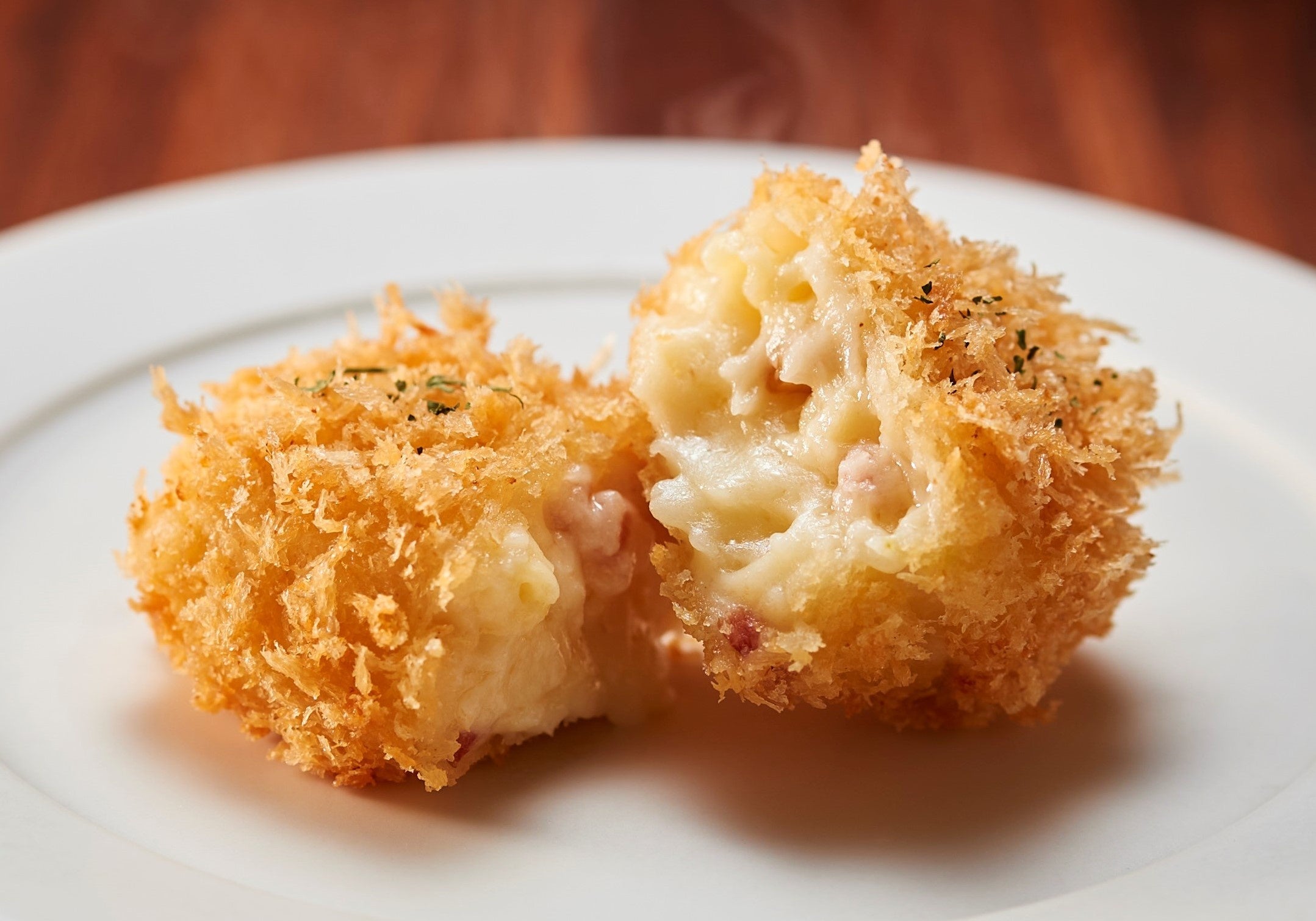 4種のチーズ(ゴーダ、グリュイエール、モッツァレラ、パルミジャーノ・レッジャーノ)を合わせたコクのあるベシャメルソースに、ベーコンの旨みと玉ねぎの甘味を合わせて。とろーり広がるソースの口どけのよさにサクサク衣がたまらない、冬においしい自信作です。