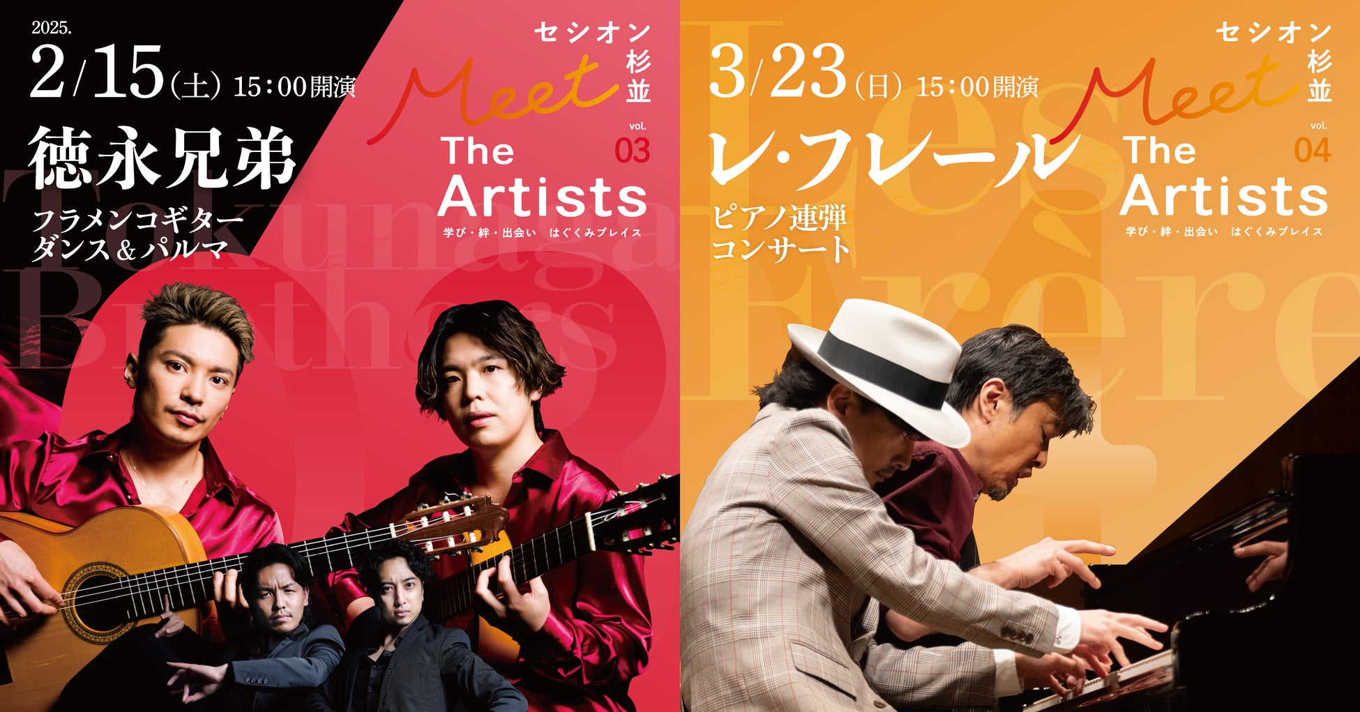 セシオン杉並にて開催。“本物のアーティストと出会える原体験の提供”をテーマに、家族や子供たちにフォーカスを当てた公演を開催しています。今回はフラメンコギターとピアノの兄弟デュオによるコンサート。兄弟ならではの息の合った演奏をお楽しみください。また入門者でも文化・芸術に親しめるよう、ワークショップや劇場ツアーを公演本番前に実施しています。