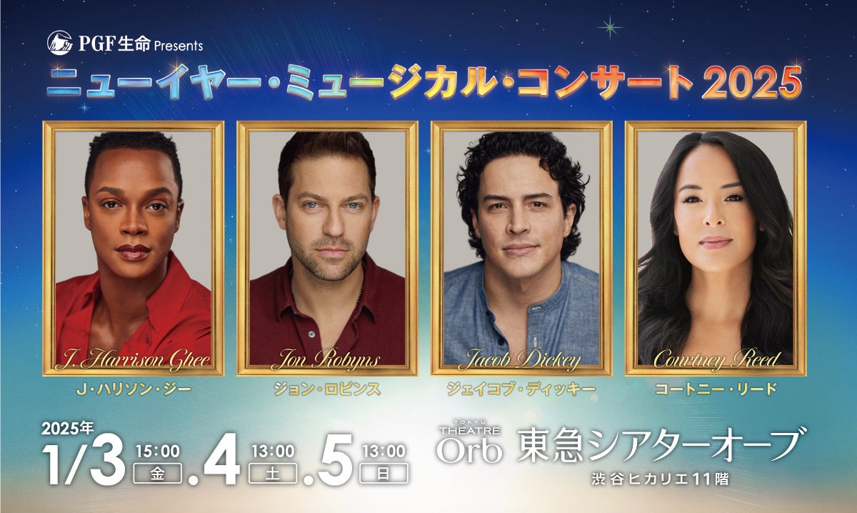 東急シアターオーブにて2025年1月3日(金)~5日(日)上演。ミュージカルの楽曲と共に新年の幕開けを祝う本コンサートは、ミュージカルファンの“観劇初め”として恒例となった東急シアターオーブの新春公演です。この度、コートニー・リード、ジェイコブ・ディッキーの出演が決定。このコンサートならではの豪華ミュージカルスターたちによる競演にどうぞご期待ください。