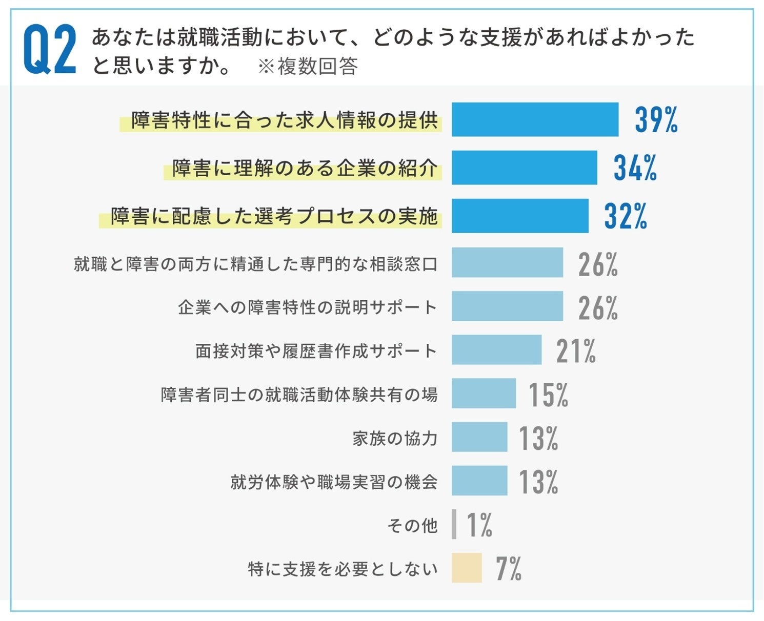 障害者雇用枠での就職活動においてどのような支援があれば良かったか聞いたところ(複数回答)、1位は『障害特性に合った求人情報の提供』(39%)、2位は『障害に理解のある企業の紹介』(34%)、3位は『障害に配慮した選考プロセスの実施』(32%)という結果でした。