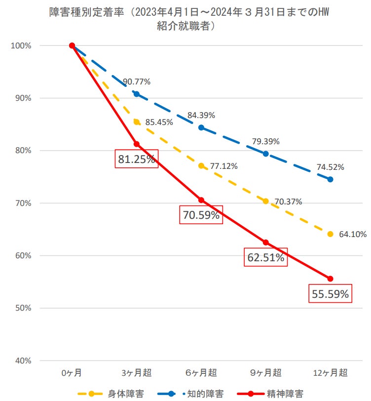 その結果、精神障害者の定着率においては55.59%(※)と、1年以内に半数近くが離職している実態があります。
