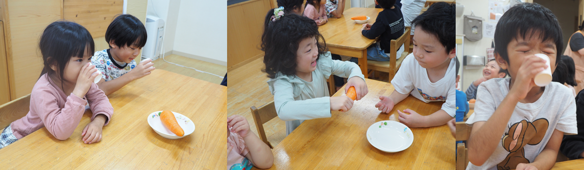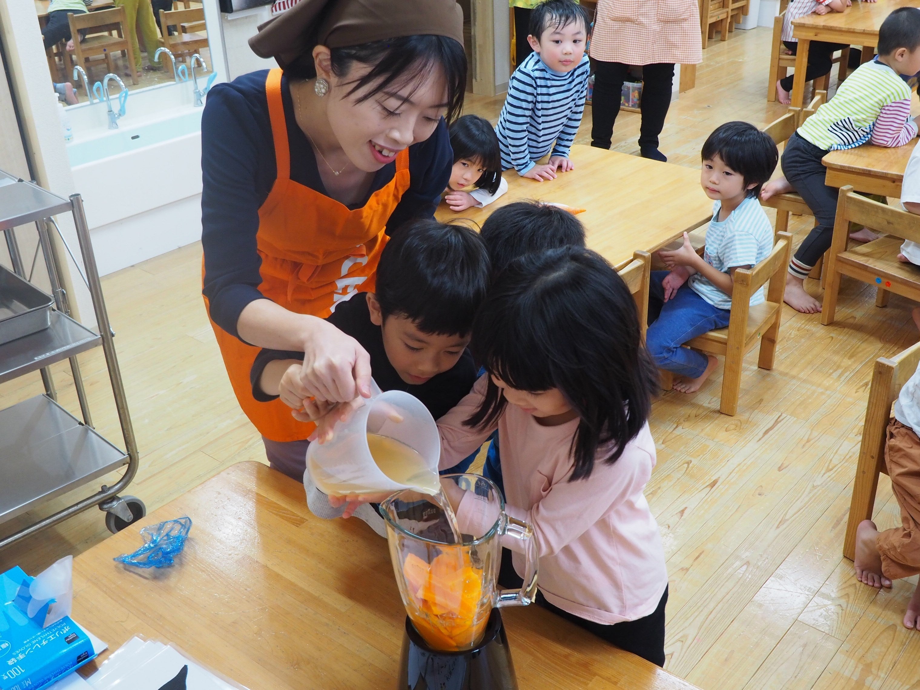 食べ物の大切さをテーマにした紙芝居に子どもたちも真剣に耳を傾け、野菜シルエットクイズでは子どもたちが元気よく手をあげていました。人参を手に取ってにおいを嗅いでみたり、硬さを確かめてみたり、机に置かれた人参を前にしてさまざまな反応を見せていました。その後、人参とリンゴ飲料を使ってジュースを作りみんなで実食。「おいしい!おかわりしたい!」という子もいれば、においが苦手で鼻をつまみながら飲んでいた子、レモン汁も入れているので「ちょっと酸っぱいね」と味の感想を言っている子もいて、それぞれが人参と向き合っていました。今回の食育イベントでは、ほとんどの子どもたちが完食!苦手な食材でも、実際に手に取り自分たちで調理・工夫して食べてみることで美味しく食べられることが分かりました。