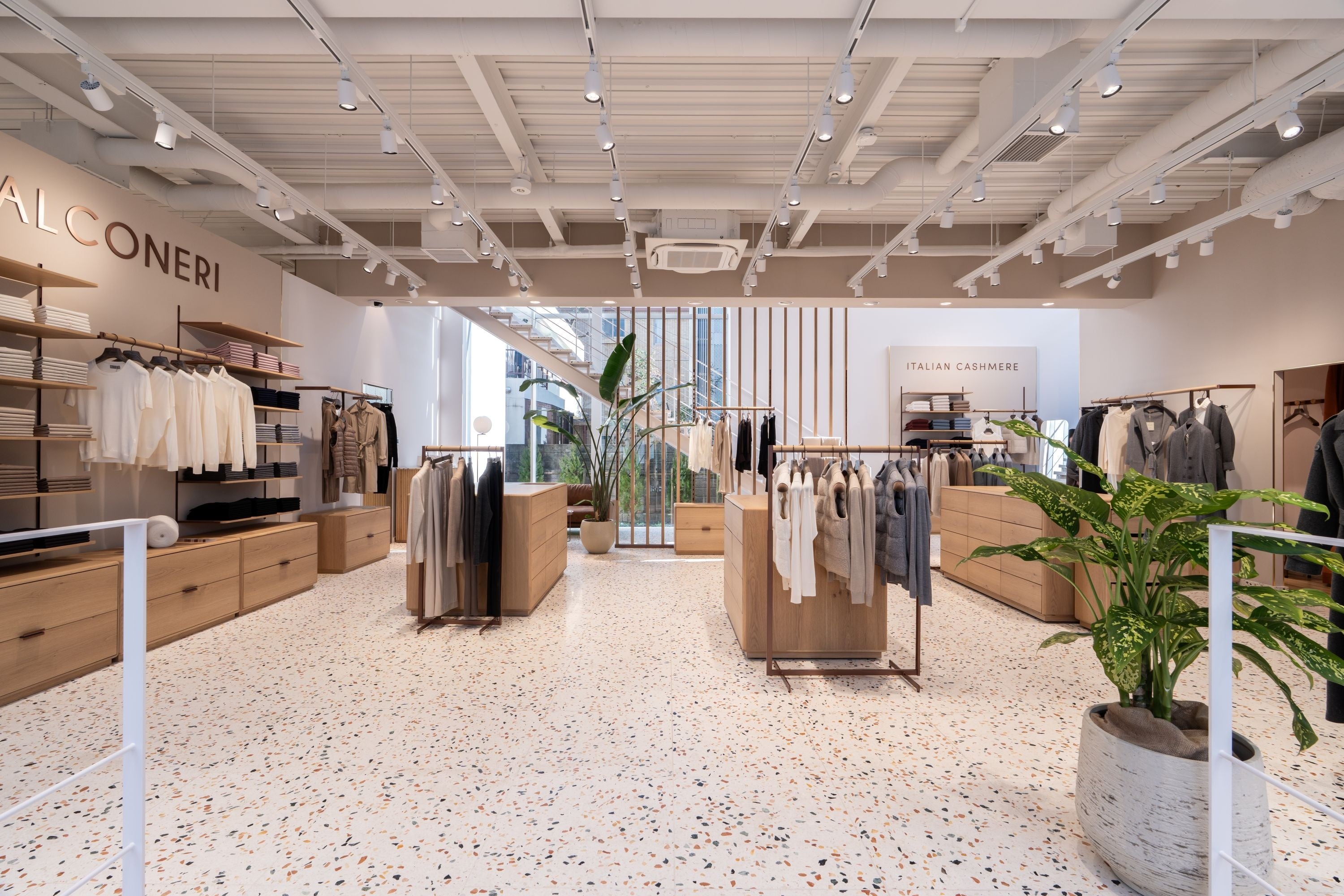 内観は、スケルトンコンセプトに基づき、大きなガラスウィンドウが特徴の店内には自然な陽の光がたっぷり降りそそぎ、明るく温かみのある雰囲気を醸し出しています。ウィンドウからの自然な光と高い天井の開放的な空間に、優しいベージュトーンの壁と木目調の家具が調和し、繊細な素材や色が映えるようになっています。1階がレディース、2階がメンズの商品を展開し、いずれのフロアでも充実した品揃えとなっています。