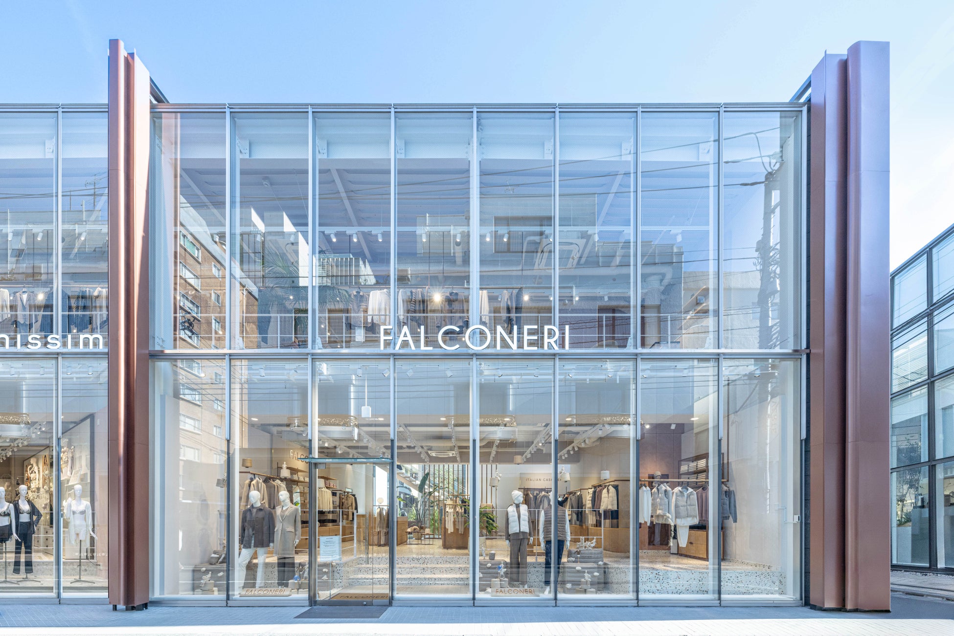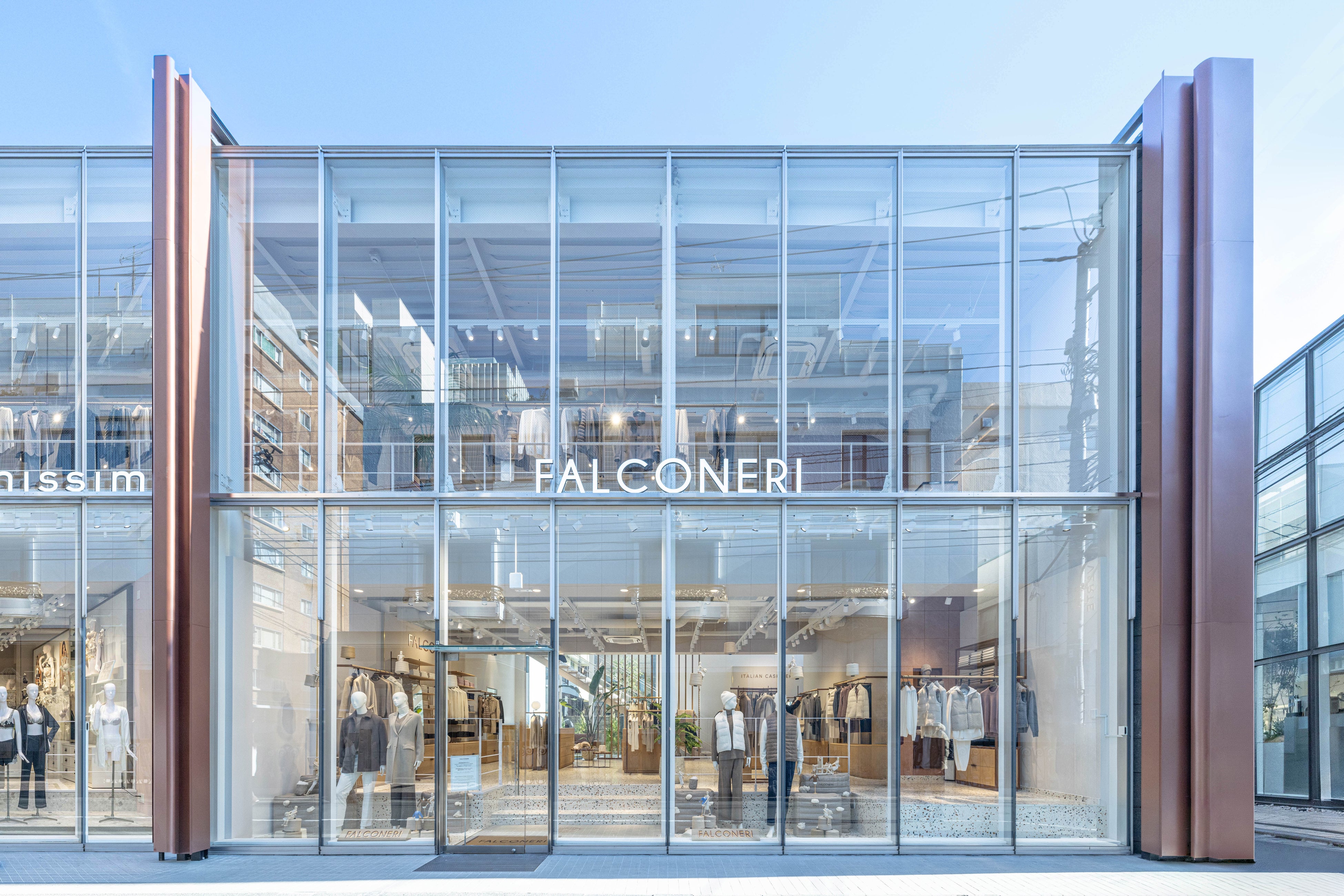青山通りから一歩入り喧騒を逃れたエリアに佇むこのショップは、姉妹ブランドのINTIMISSIMIと隣り合わせとなっており、FALCONERIは地上2階の日本で最大級の広さを誇る店構えとなっています。