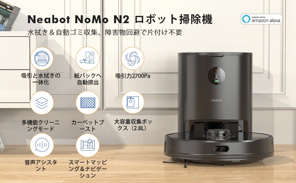 - ·❸【水拭き&ゴミ収集全自動】 Neabot NoMo N2 ロボット掃除機 自動ゴミ収集ボックス付き 水拭き機能搭載 自動充電/ゴミ排出 スマートマッピング トラブル回避/衝突・落下防止 2700Pa App対応 掃除時間/範囲/回数を設定 Wi-Fi接続 Alexa対応(ブラック)