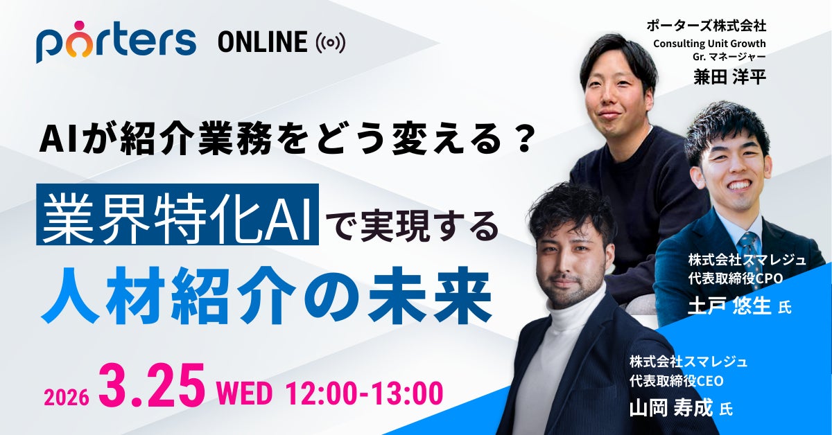 人材ビジネス向けマッチングシステムを提供するポーターズ株式会社(東京証券取引所グロース.証券コード5126、東京都港区、代表 西森 康二)は、株式会社スマレジュと共同で「AIの活用でもう頭を悩ませない!スマレジュ×PORTERSが実現する紹介業務の未来」と題した無料セミナーを2026年3月25日(水)12:00~オンラインで開催いたします。