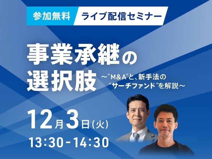 株式会社ストライク(東京都千代田区、代表取締役社長:荒井邦彦)は12月3日(火)に山口キャピタル株式会社と共にライブ配信セミナー『事業承継の選択肢~“M&A”と、新手法の“サーチファンド”を解説~』を開催いたします。