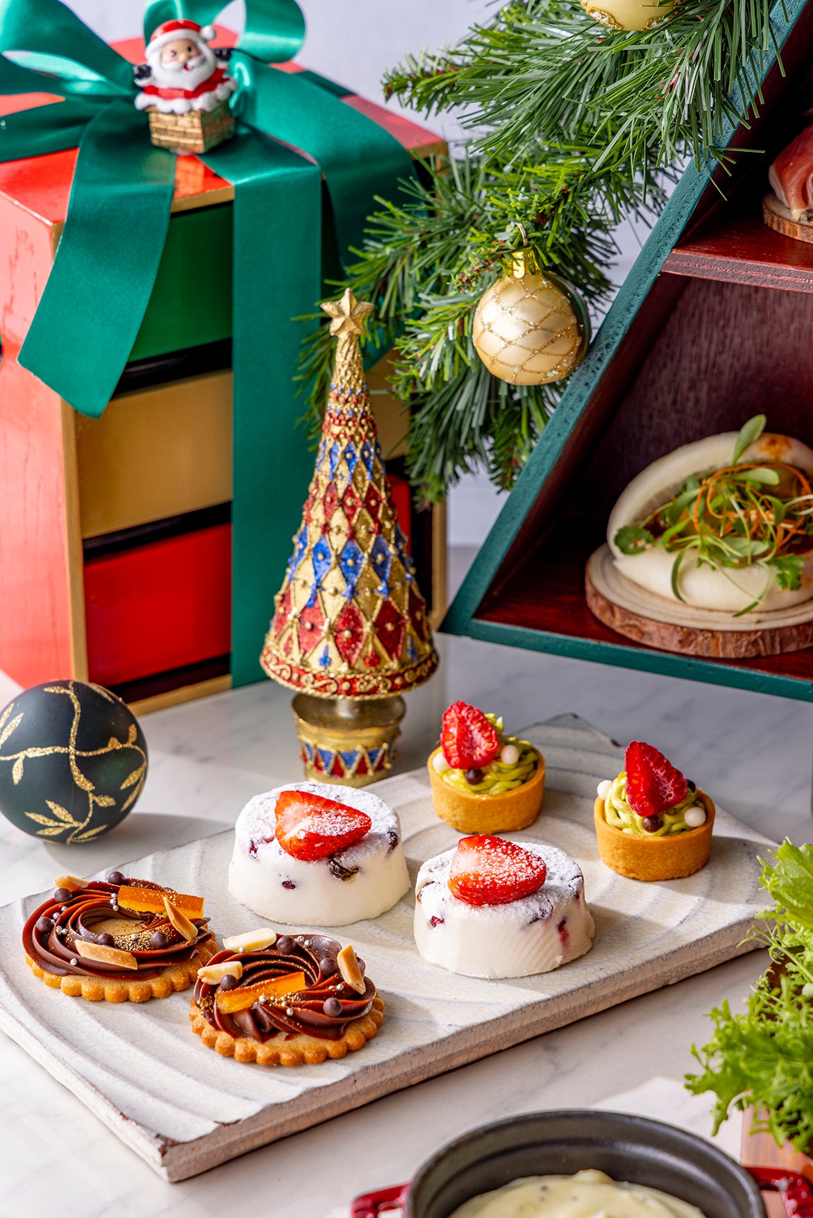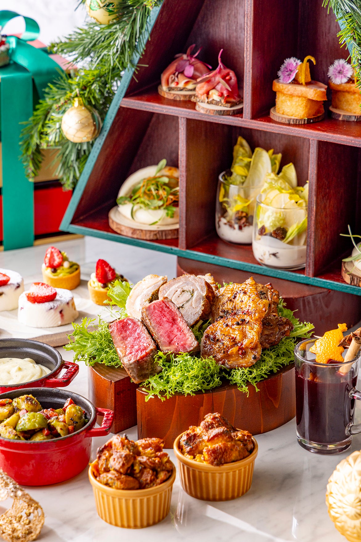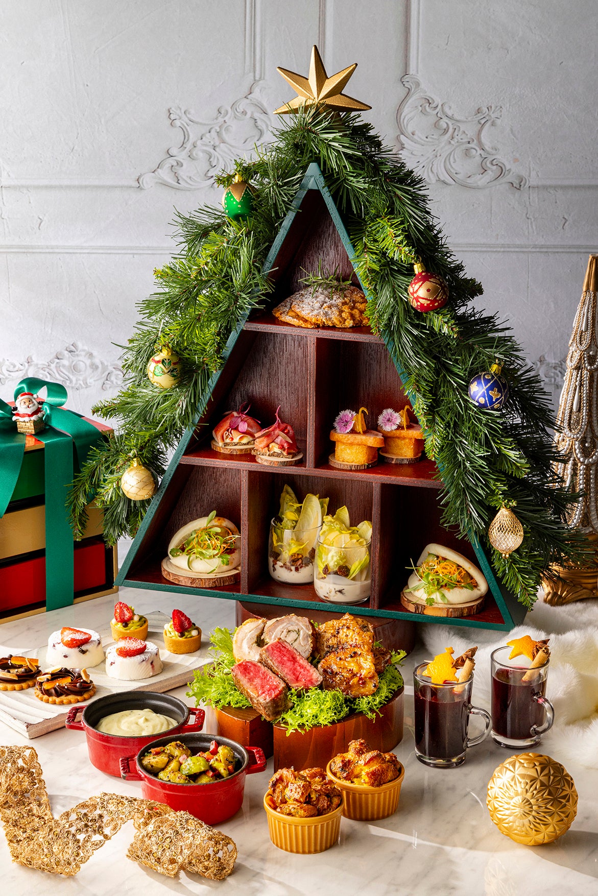 特製クリスマスツリー型スタンドには「スモークダックトースト 無花果ジャム」など5種類のサイドディッシュが彩りよく配され、まるでクリスマスプレゼントを1つずつ開けているようなワクワク感をお届けします。フェスティブシーズンにふさわしい3種類の本格肉料理、「クリスマスリース チョコレートガナッシュタルト」など3種類のクリスマススイーツに加え、レモンピールやシナモンを利かせた「ホットワインショット」や「サンタさんへのおもてなしクッキー」もセットに。テーブルいっぱいに広がるクリスマスのごちそうと共に華やいだお食事のひと時をお過ごしいただけます。
