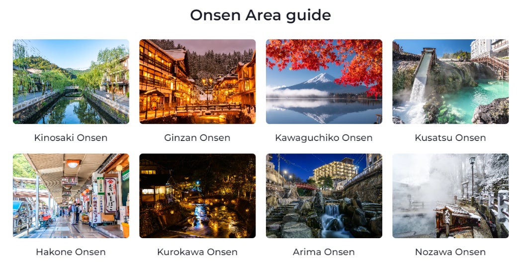 草津温泉、箱根温泉などの訪日外国人に人気の高い温泉地については、エリアガイド・温泉の泉質・歴史・主要空港や駅からのアクセスなどの情報をまとめて掲載。目的の温泉地の情報を凝縮してお届けします。