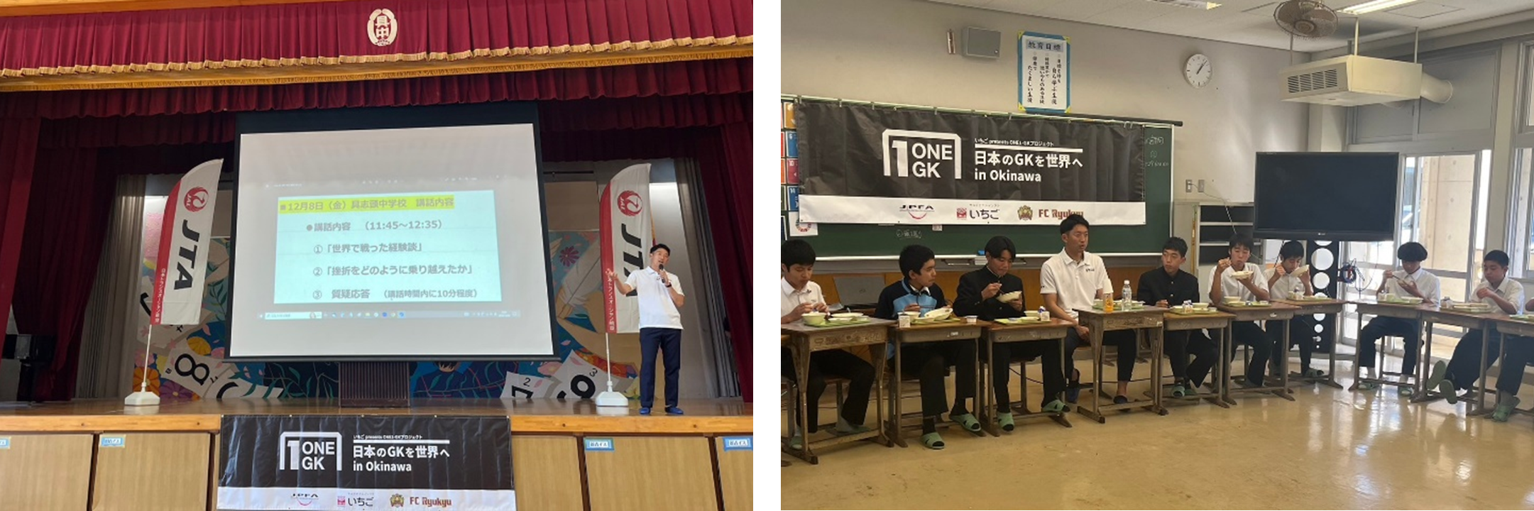 プロジェクト初日となる12月8日(金)は、権田修一選手による、沖縄県具志頭中学校訪問を実施いたしました。権田選手が、世界で戦ったご自身の経験談や、挫折をどのように乗り越えたかといったテーマの講和に、全校生徒が熱心に耳を傾けました。また、終了後には、生徒たちと給食をいただきながら交流をしました。