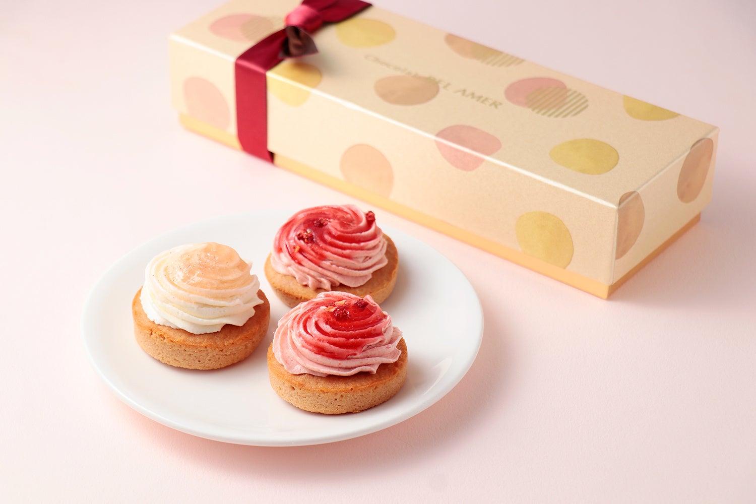 ルビーチョコや生クリームを加えしっとりと焼き上げたケーク生地に、空気を含ませたムース仕立てのクリームを合わせ、プチガトーを思わせる華やかなデザインに。