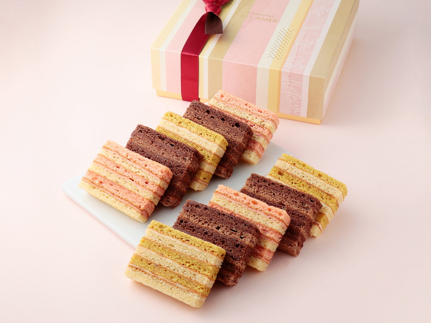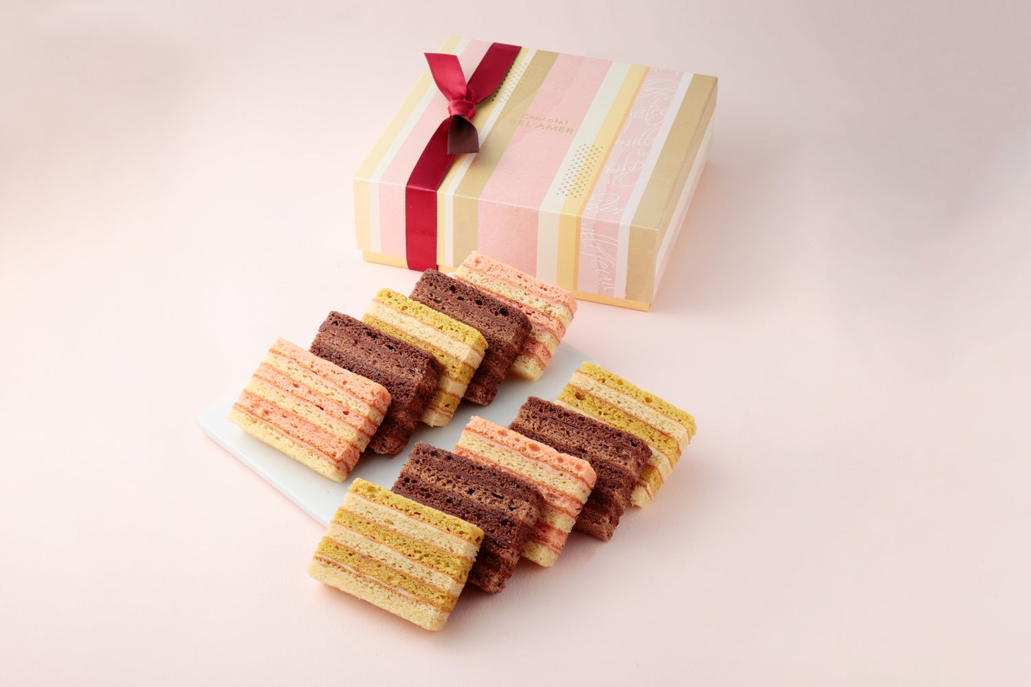 ムースショコラケーキ2コ、ガトーミルフィーユ3コ、パレショコラ5枚を詰め合わせた、焼菓子とショコラの両方を楽しめるバラエティ豊かなアソートです。