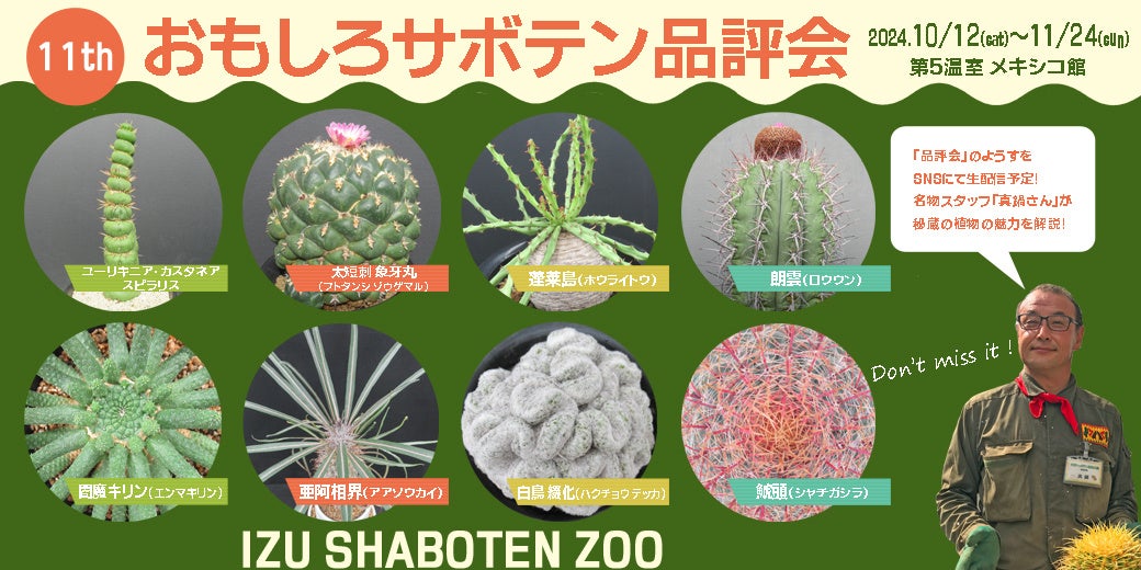 伊豆シャボテン動物公園では、2024年10月12日(土)~11月24日(日)まで、第5温室メキシコ館内において毎年好評を博している「第11回おもしろサボテン品評会」を開催いたします。
