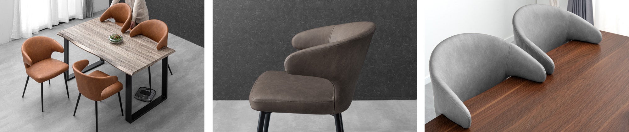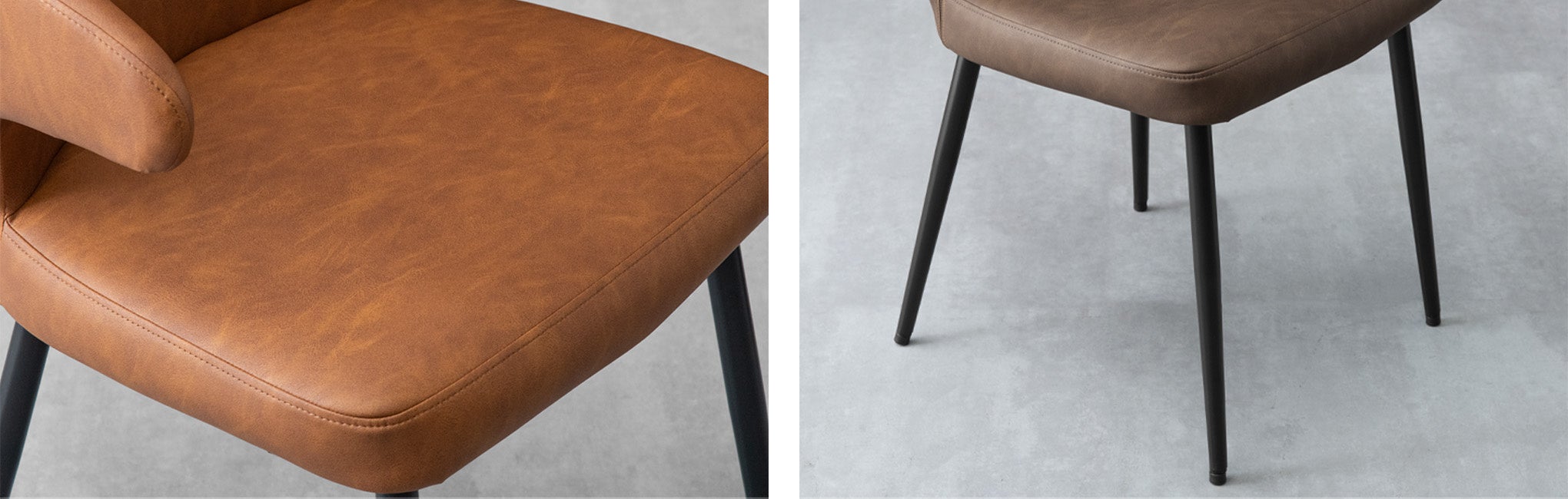 今回新たに登場した3種類のダイニングチェアは長年使用したレザーのようなムラやシワ感をリアルに表現したエイジング生地を使用しているのでヴィンテージ感のある風合いに仕上がりました。