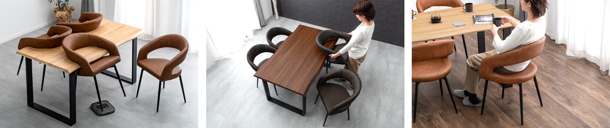 今回新たに、ヴィンテージの風合いを表現したエイジング生地に深みのあるブラックアイアンでモダンな仕上がりを演出するヴィンテージモダンスタイルのお掃除ロボットに対応したダイニングチェアが3種類登場しました。