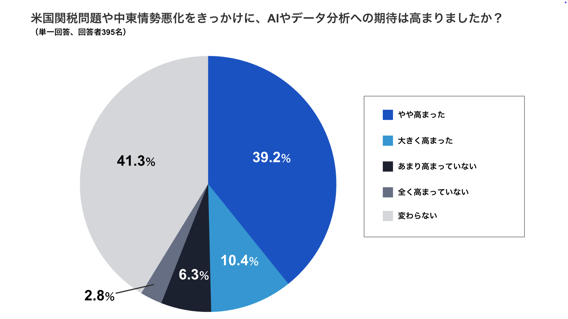・米国関税問題や中東情勢悪化をきっかけに、AIやデータ分析への期待が「大きく高まった(10.4%)」「やや高まった(39.2%)」と回答した管理職は合計約5割(49.6%)にのぼりました。