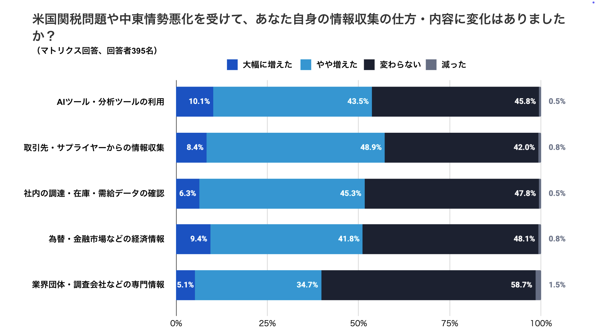 ・情勢変化を受けて情報収集の仕方や内容が変化したと感じる管理職は、項目によって異なるものの「大幅に増えた」「やや増えた」の合計で半数弱にのぼりました。最も増加割合が高かったのは「取引先・サプライヤーからの情報収集(57.3%)」で、次いで「AIツール・分析ツールの利用(53.6%)」「社内の調達・在庫・需給データの確認(51.6%)」が続きました。