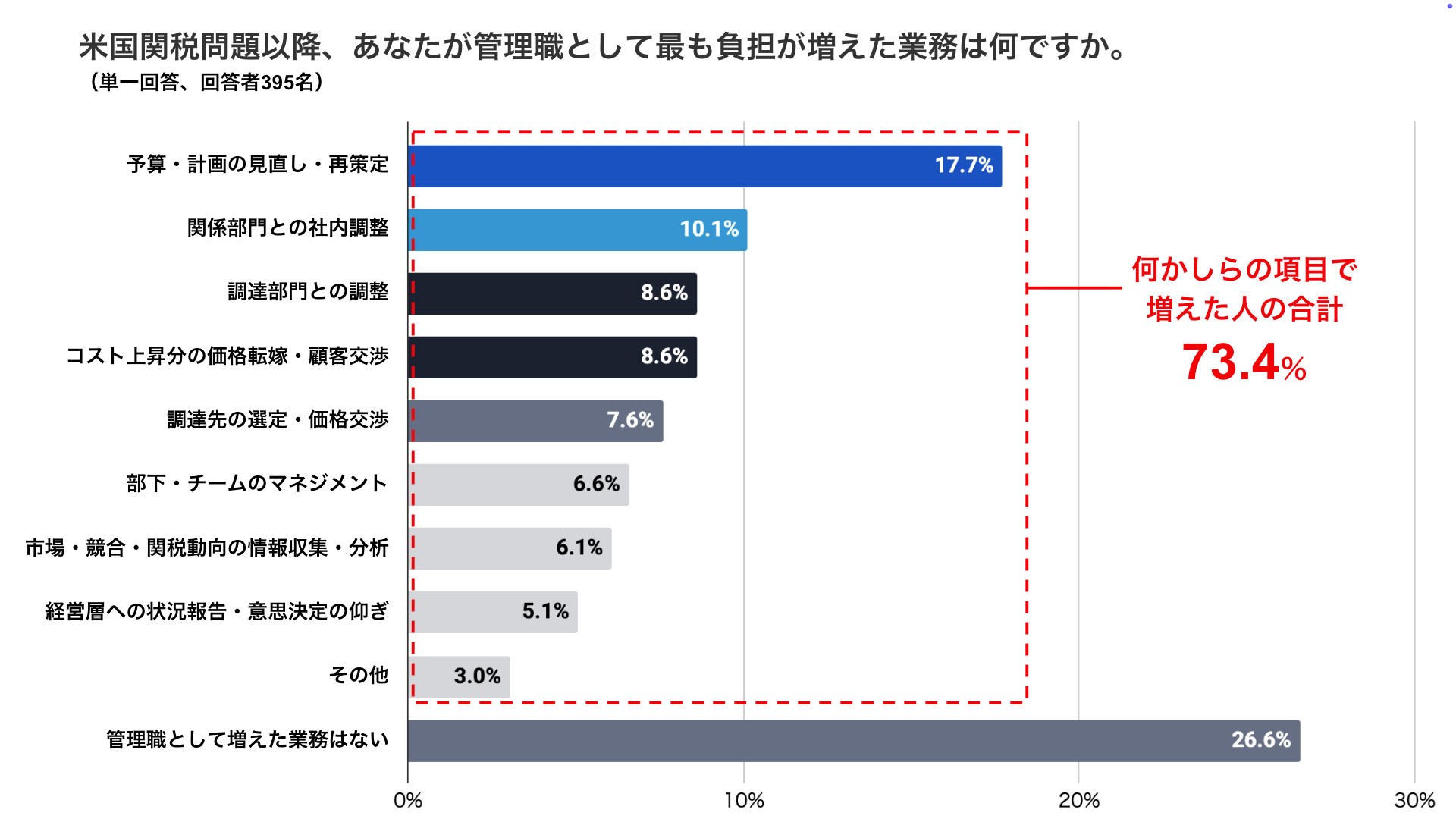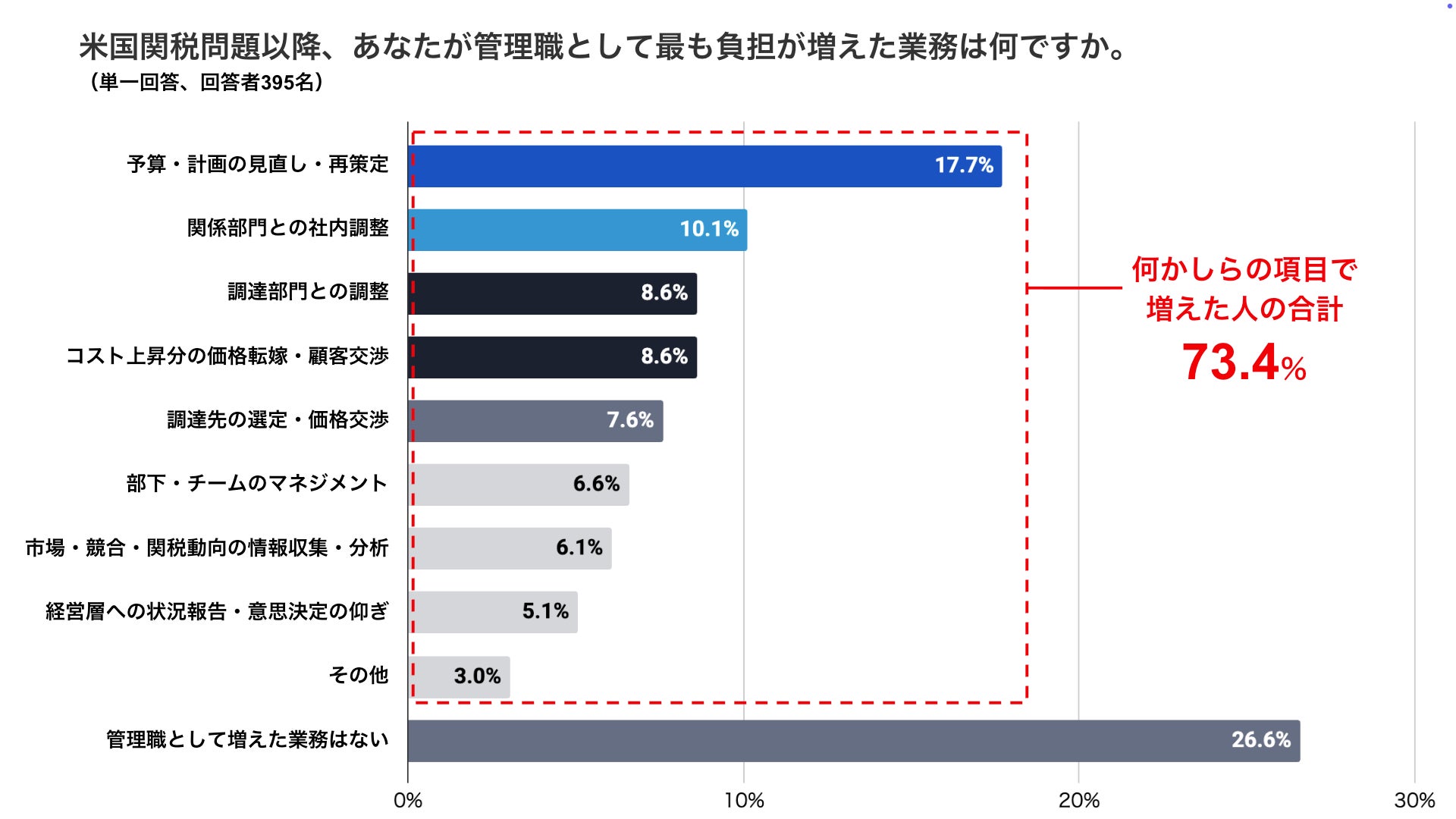 ・管理職の約7割が米国関税問題以降に業務負担の増加を実感。最も負担が増えた業務は「予算・計画の見直し・再策定(17.7%)」が最多となりました。